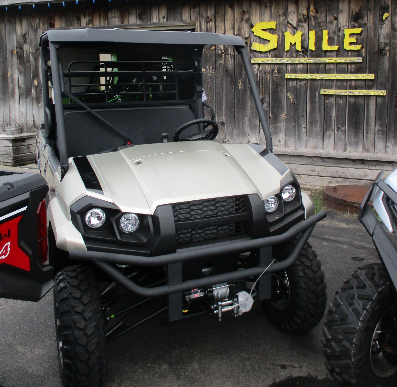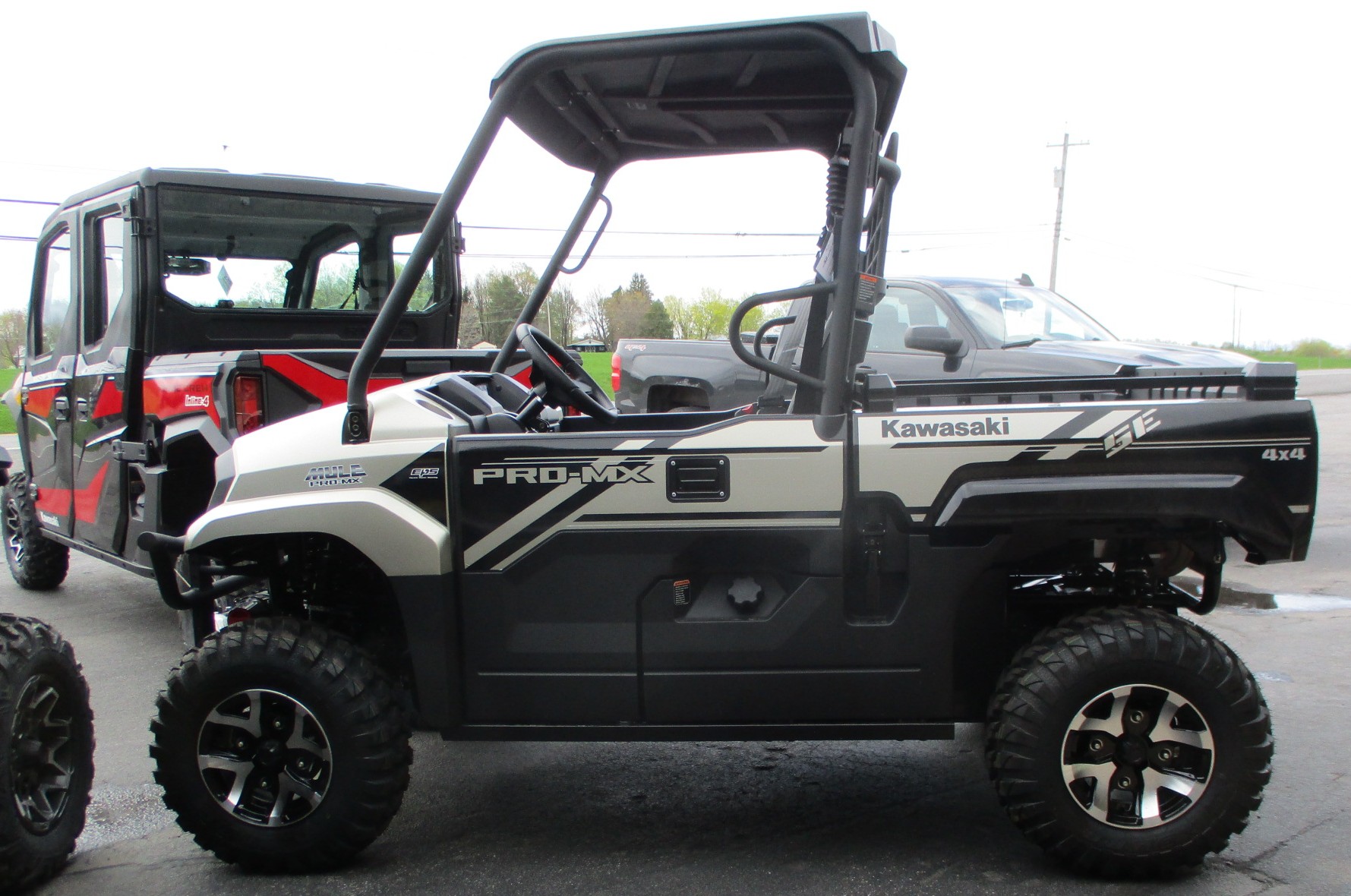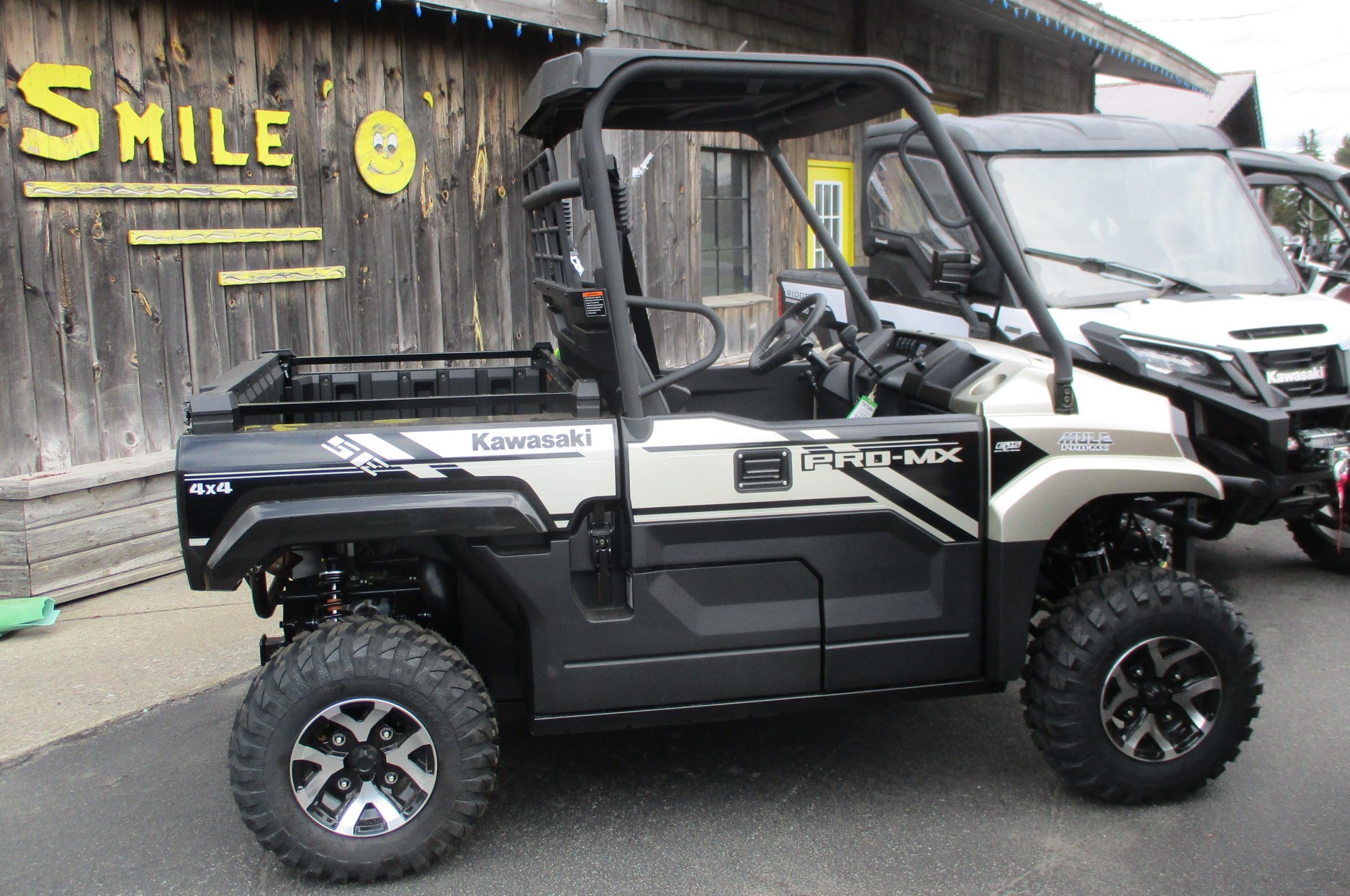 $1250 Factory REBATE is on now !! 2025 Kawasaki MULE PRO-MX EPS SE mid size UTV / SxS offers a comfortable fit for two passengers. Has the muscle to get the work done so there is more time for fun on the trails. The special edition model has the premium color Gold with Black trim. SE package also includes the 3,500lb Warn winch, HD front bumper, EPS power steering, sun top roof and the cast alloy wheels with 25″ tires. Features a fuel injected 695cc engine and the CVT automatic transmission. Selectable 2WD, 4WD and rear differential lock. Independent front and rear suspension. 699 lb cargo bed load and 1500 lb towing capacity. Halogen and LED headlights. Comes with Kawasaki’s awesome 3 year warranty. No hidden fees or charges – $15,868 including REBATE. We take trade-in’s too !