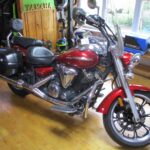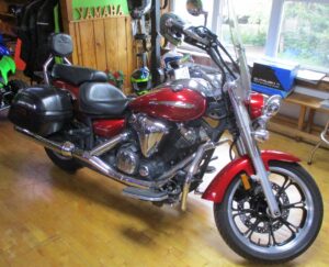 2010 Yamaha V-Star 950 Tourer Edition with only 13,696 miles. Color is called Candy Red. This touring motorcycle comes set up from the factory to take you down the road in comfort. 950 cc V-Twin fuel injected motor, 5 speed transmission, belt drive and those cool cast mag wheels. Engine is designed for low to mid range torque and the bike has a well balance feel with low seat height at only 26.6″.  Driver floorboards with heel / toe shifter, windshield, saddlebags, passenger backrest with luggage rack, driving lights and more. Nice bike for $5895.