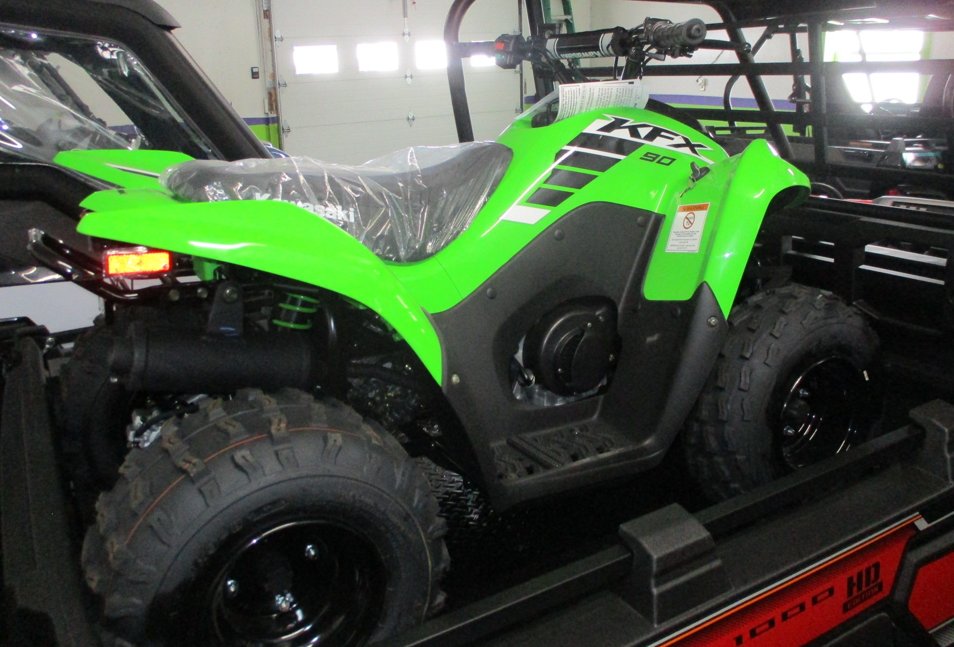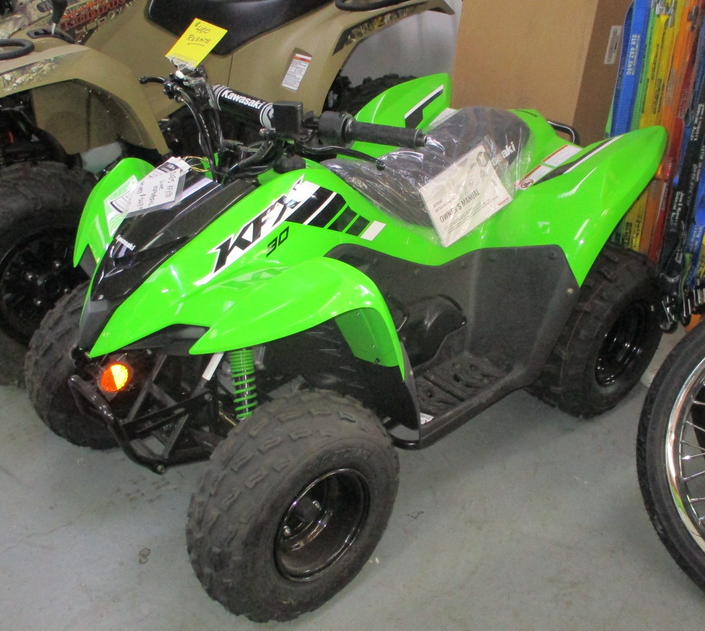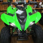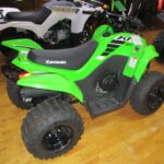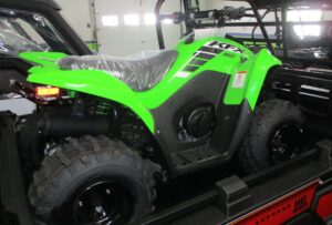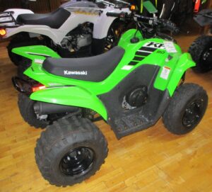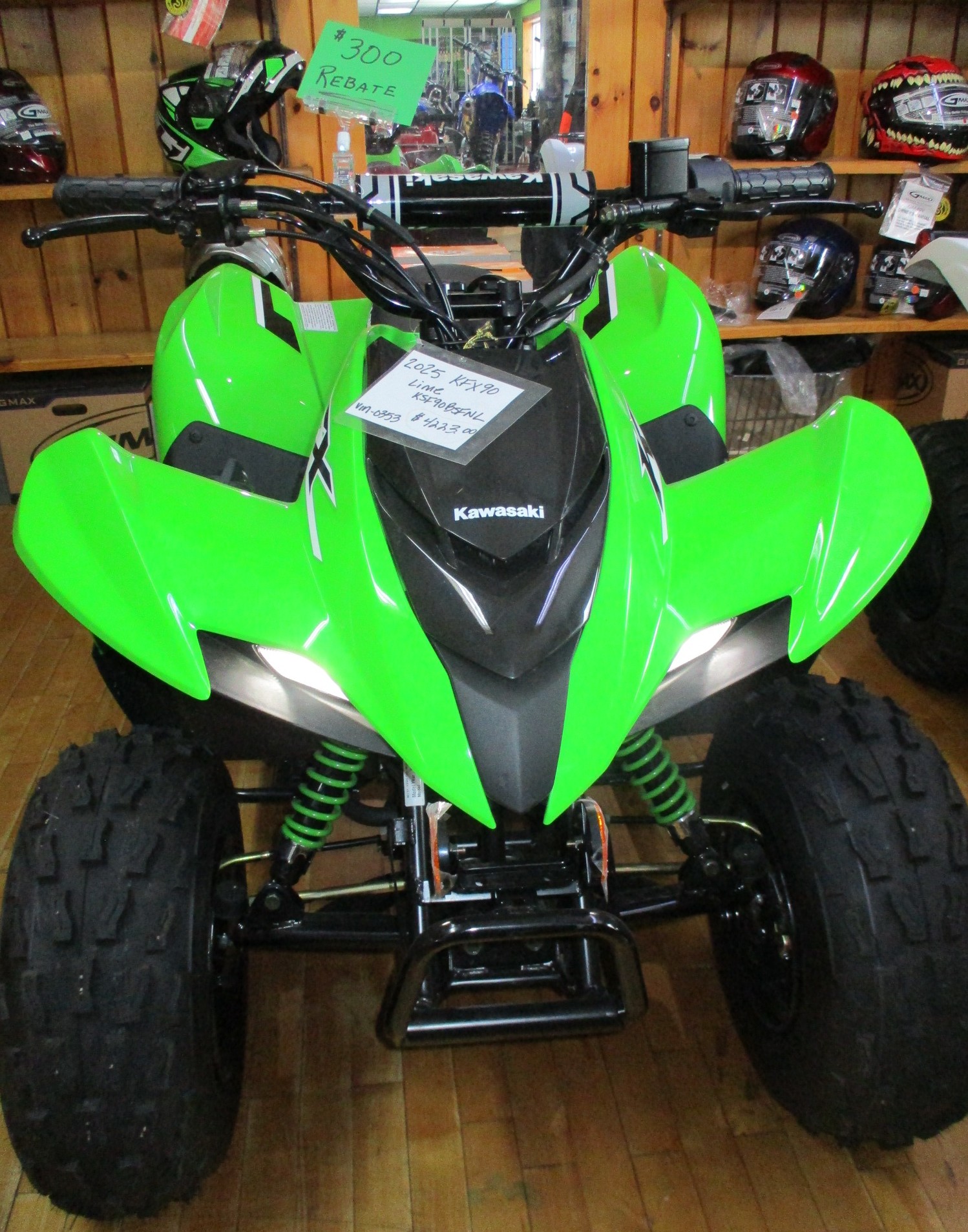 $300 Factory REBATE is on now !!  2025 Kawasaki KFX 90 youth ATV. Great way to get them started out for a lifetime of fun. 90cc 4 stroke engine with CVT automatic transmission and electric start. Front LED accents lights and rear LED taillights for safety.  Has an adjustable throttle limiter so you can set the speed as their skill level grows. Needs a key to operate just like the big ones. Lime Green is the color. 1 year factory warranty. No hidden fees or charges $3,923 including REBATE – We take trade-in’s too