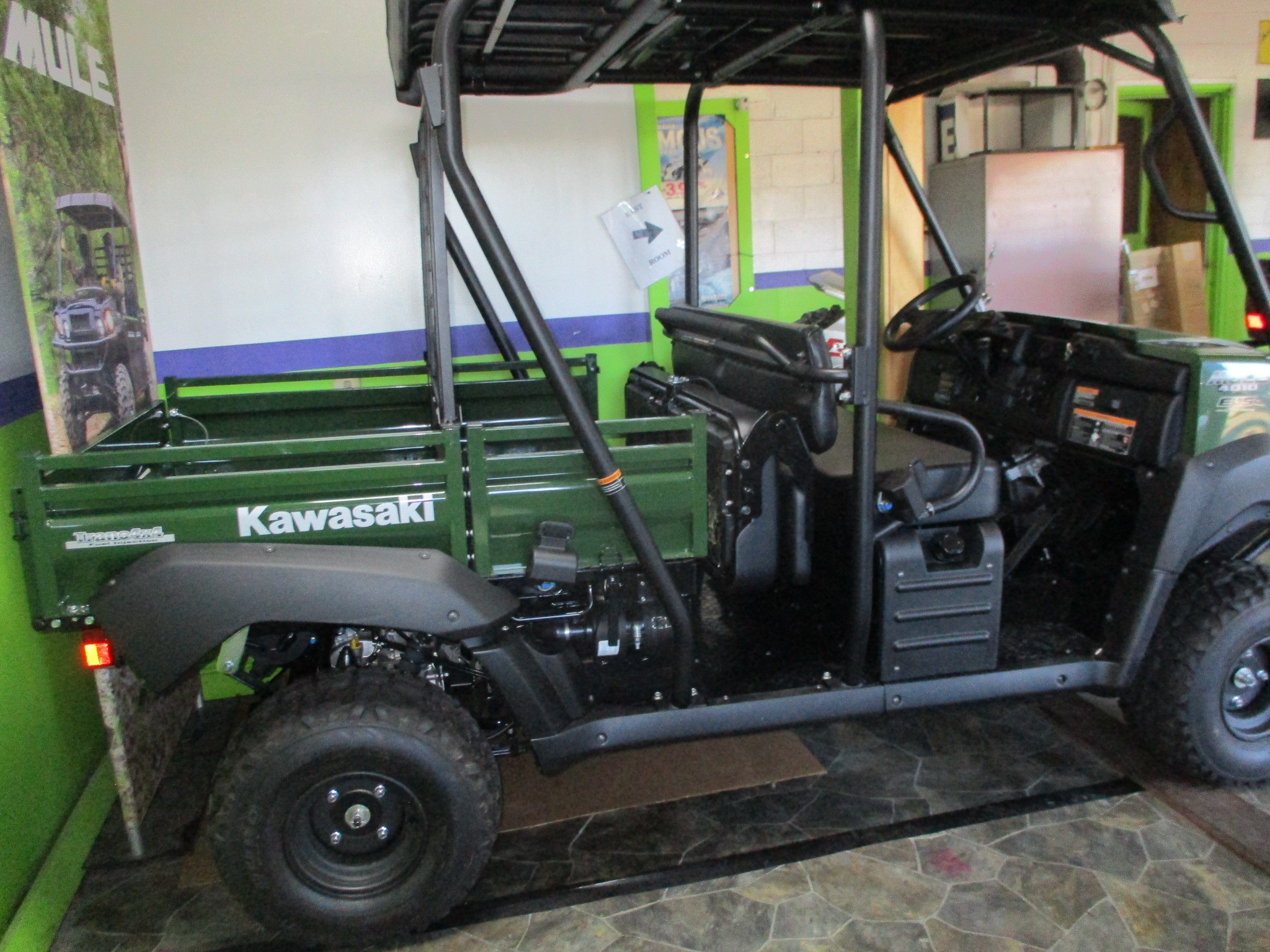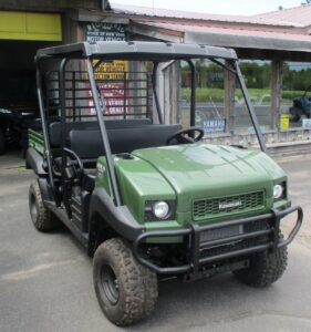 $500 Factory REBATE is on now !  2025 Kawasaki Mule 4010 UTV Trans Cab model in the Timberline Green color.  No frills 4×4 work machine that is adjustable between 2 or 4 passengers. Rear seat slides forward to extend the cargo area. Perfect machine for jobsites, camp or farm. Get the work done quickly and keep moving forward on your projects. Fuel injected 617cc V-Twin engine with CVT transmission. Dual mode rear differential with locking feature. Up to 1300lbs cargo load and 1,200lbs towing capacity. HD front bumper, 23″ tires on steel wheels and halogen headlights. We have added on optional roof.  No high pressure sales – No hidden fees or charges -$15,087 including REBATE