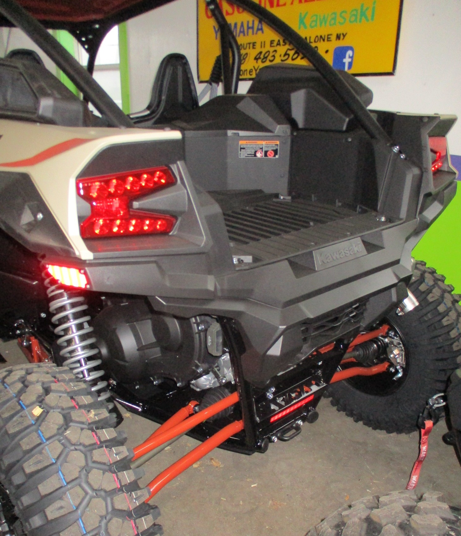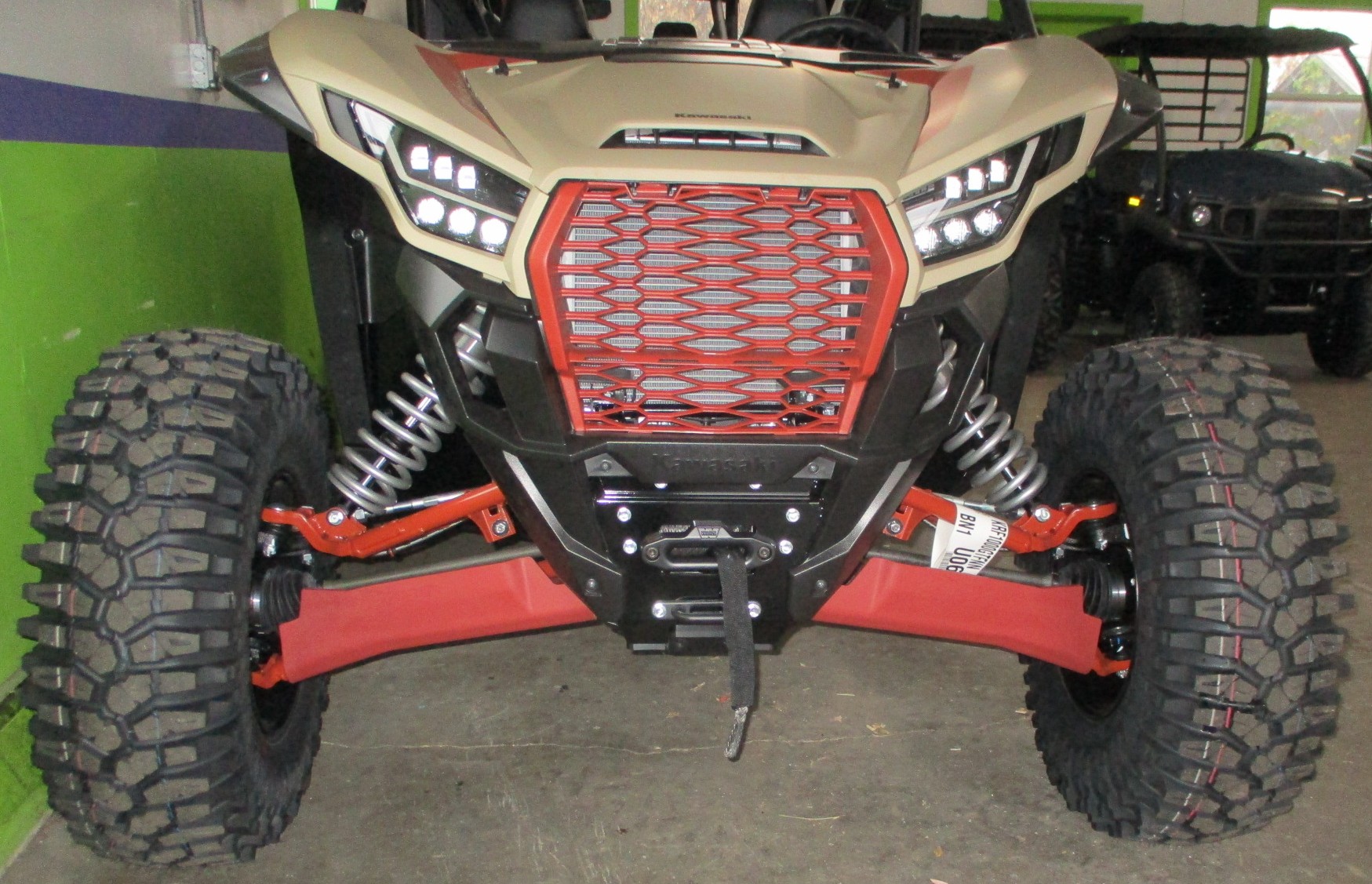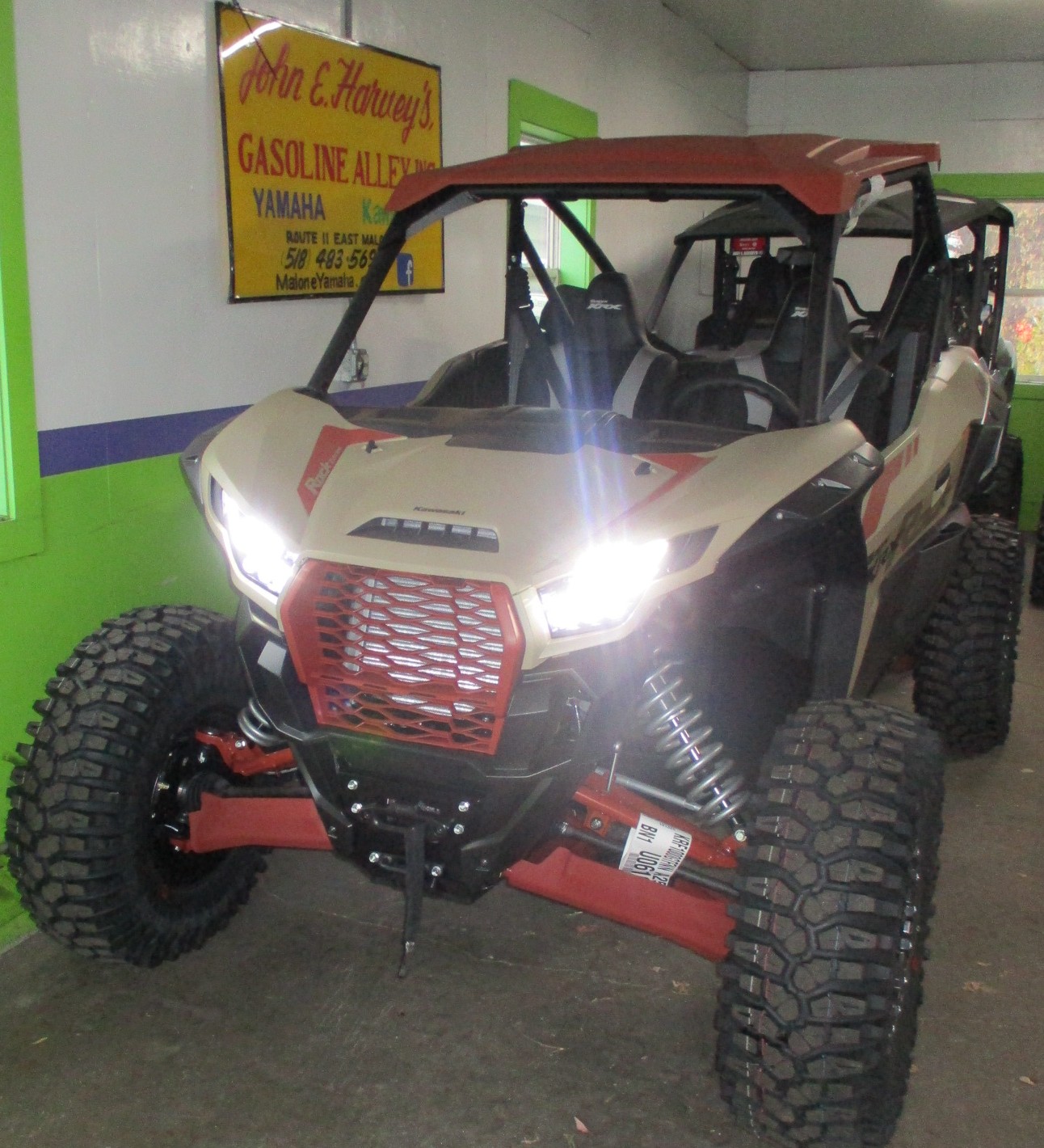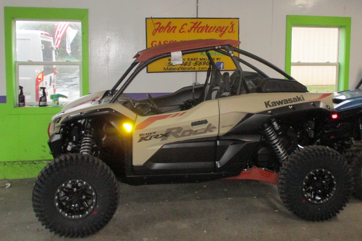 2026 Kawasaki Teryx KRX1000 Rock Edition Side x Side. This sport SxS has plenty of room for 2 adults. 110HP high torque 999cc fuel injected liquid cooled twin cylinder engine, electronic throttle valves and built-in engine braking system. Automatic CVT transmission, selectable 2WD/4WD with locking front differential. 3 power delivery modes. Fox piggyback shocks are fully adjustable to soak up all the rough stuff. Warn winch, Roof, LED lights, EPS power steering, Alloy bead lock wheels with 32″ MAXXIS 8ply Roxxzilla tires, Poly skid plates and much more. Color is called Matte Dark Beige/Brownish Orange.  No hidden fees or charges  – $26,958.  We take trade-in’s too.