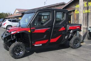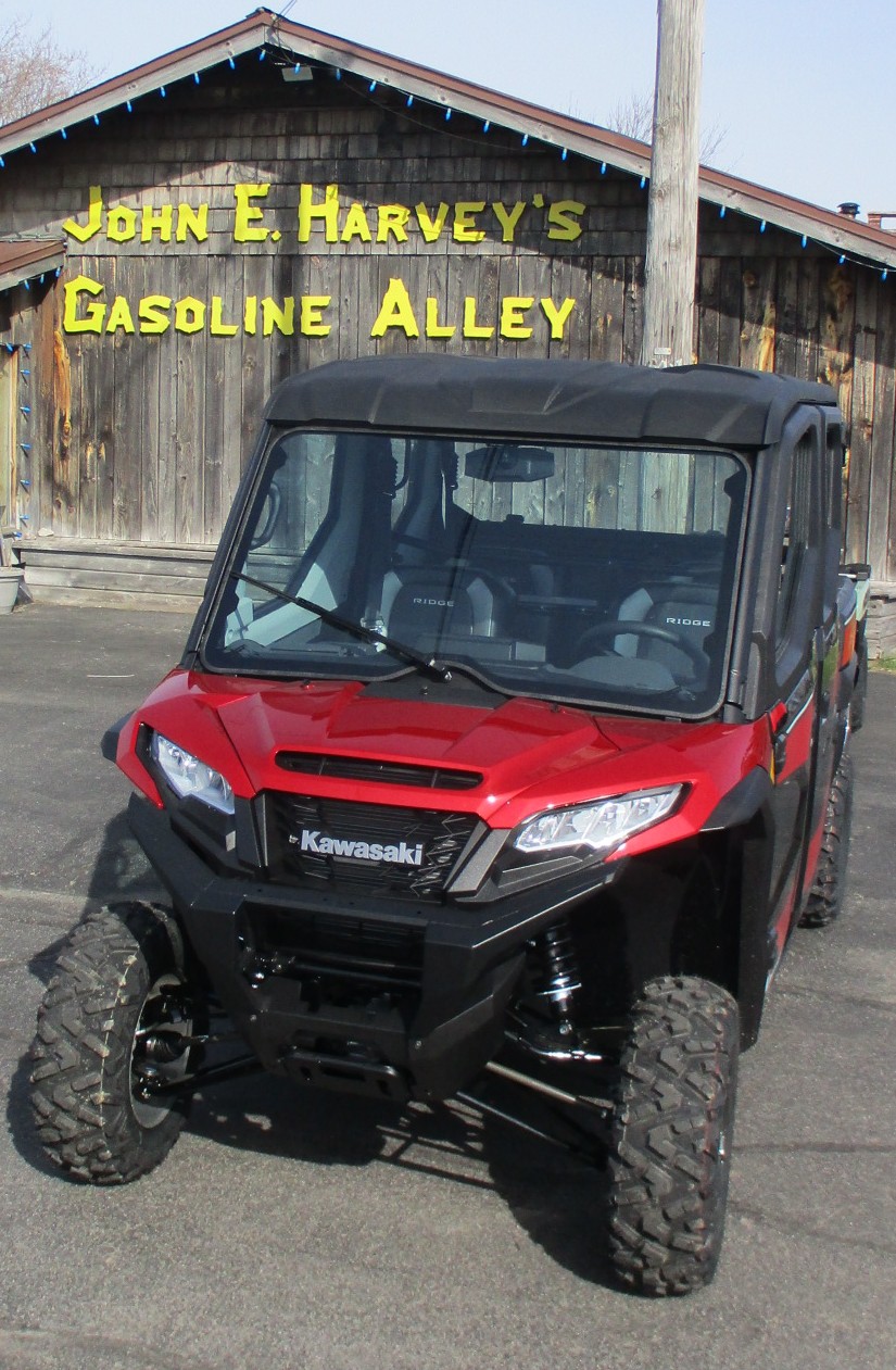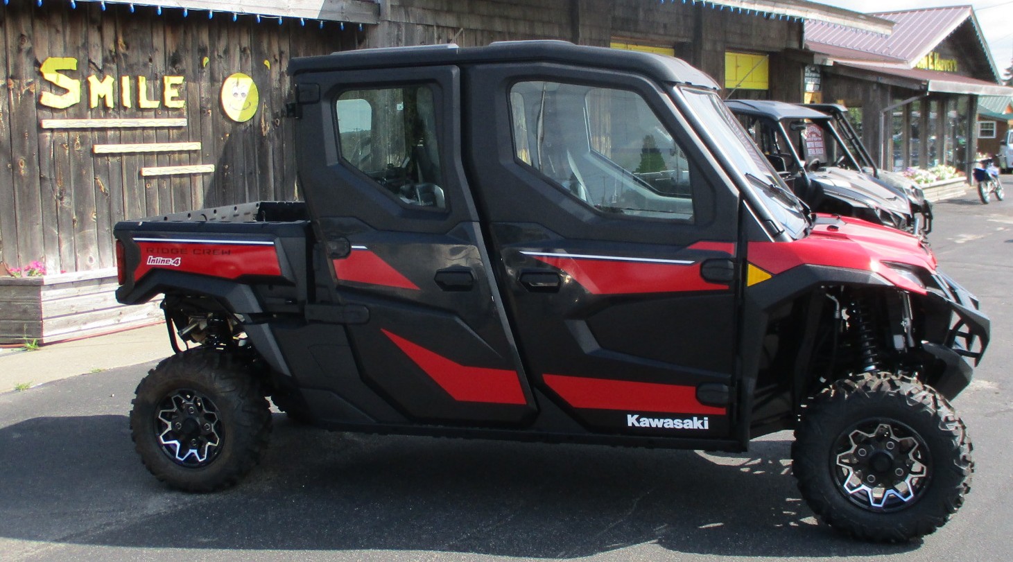 $4,500 Factory REBATE is on now! 2025 Kawasaki Ridge Crew HVAC 1000 – 6 Passenger 4 door Premium year-round SxS / UTV. Color is called Candy Persimmon Red. Total Heat, A/C and Ventilation system. ERGO-FIT System, Rideology APP and full screen TFT instrumentation. EPS rack & pinion power steering, power windows & windshield wiper. 92 hp smooth 999cc 4-cylinder engine with adjustable power delivery modes, CVT transmission with High & Low range, selectable 4wd with locking rear differential. Rides on cast aluminum wheels with 27″ Duro tires and lots of ground clearance. 1,000 lb capacity dump box and so many more features. Stop in and check this one out !! No hidden fees or charges – $28,733 including REBATE. We take trade-in’s too !